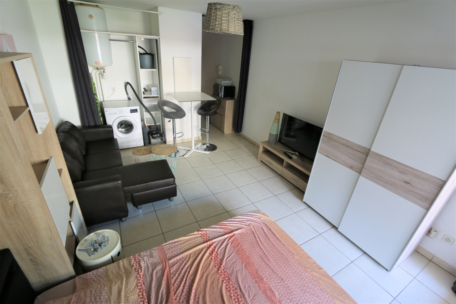 Entrée sur cuisine et salle d'eau/wc. Pièce principale intégrant un canapé et un lit.